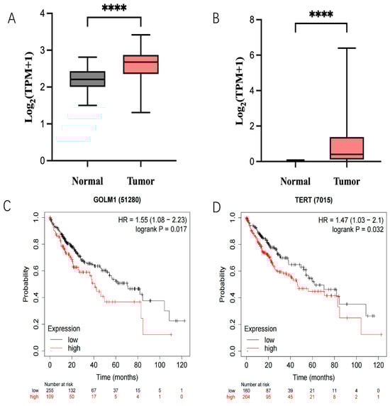 Expression of GP73 (A) and hTERT (B) in tumor tissues compared to normal tissues. Mega-sampler analysis of expression patterns about both GP73 and hTERT in cancer as well as normal tissues from TCGA dataset. (C) Kaplan–Meier survival curves of GP73 expression and Liver hepatocellular carcinoma patients. Statistical significance (****, p < 0.0001). (D) Kaplan–Meier survival curves of hTERT expression and Liver hepatocellular carcinoma patients. Statistical significance (****, p < 0.0001).