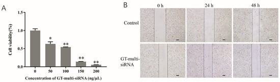 Inhibition effects of GT-multi-siRNA on the growth of Hep3B cells. (A) Inhibitory effect of different concentrations of GT-multi-siRNA on Hep3B proliferation using MTT method. The results are expressed as the means ± SDs of three biological replicates. Asterisks indicate a significant difference (* p < 0.05, ** p < 0.01) compared to the 0 ng/μL. (B) GT-multi-siRNA suppressed the migration of Hep3B cells for 0 h, 24, and 48 h by wound healing assay. The scale bar is 100 µm.