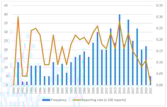 Most of the 533 reports were received since 2008 (N = 354; 66.4%), with 2014 (N = 40; 7.5%) and 2016 (N = 37; 6.9%) standing out in particular. However, the years with the highest reporting rates were 1991 and 2014. In addition, there has been a gradual decline in both the number of reports and the reporting rate since 2014 (Figure 2).