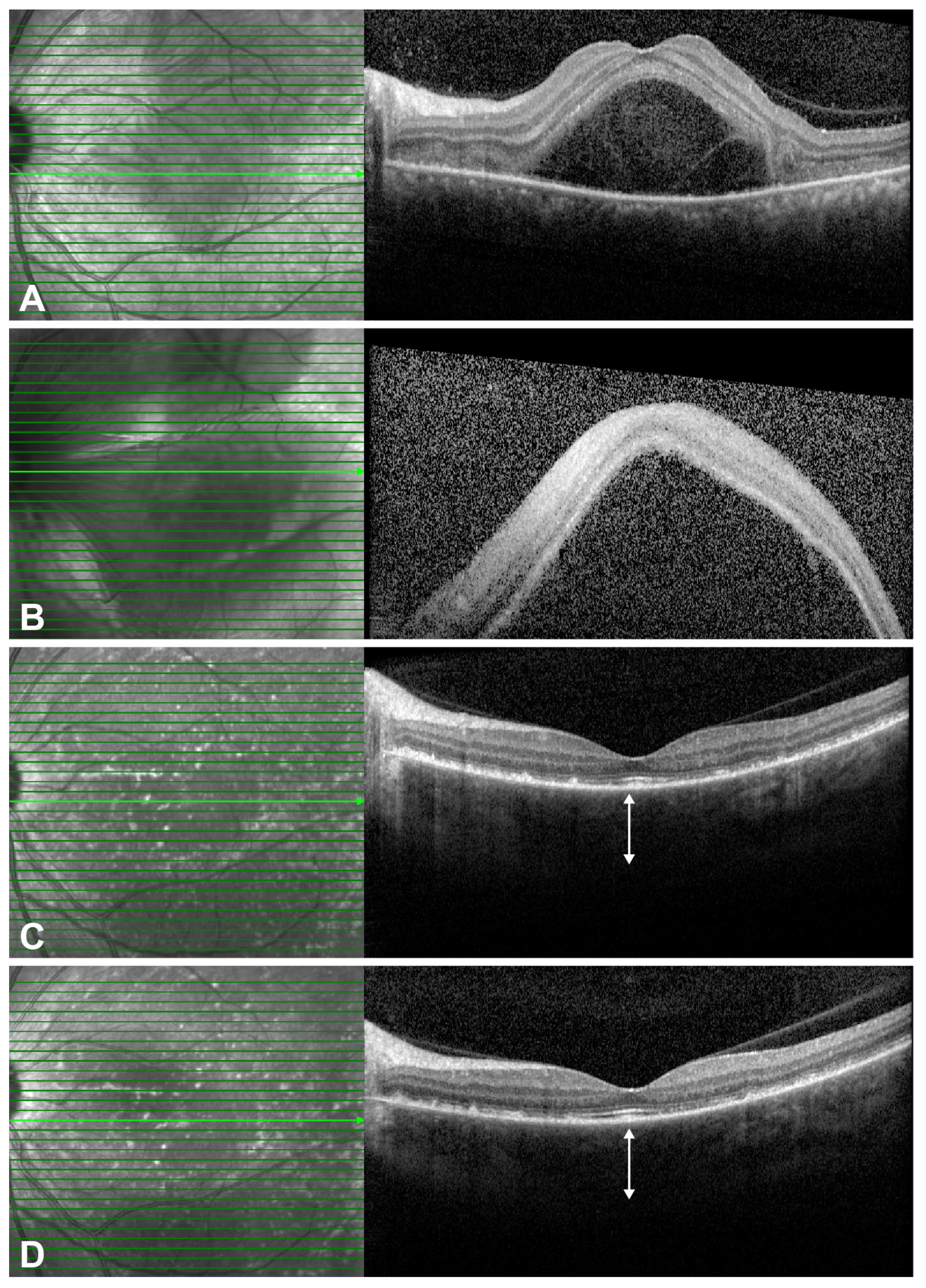 Figure 4. Serial optical coherence tomography (OCT) images from a patient with highly refractory chronic recurrent Vogt–Koyanagi–Harada (VKH) disease. (A) The initial OCT shows serous retinal detachment with subretinal septation, unresponsive to systemic corticosteroids and mycophenolate mofetil, leading to a posterior subtenon steroid injection (PSTI). (B) One week post-PSTI, the subretinal detachment worsened significantly, necessitating intravitreal dexamethasone implant treatment. (C) Three months after the implant, despite improvement in the subretinal fluid, other signs of active inflammation (AC cells, disc hyperemia) emerged, and the patient developed significant corticosteroid-related side effects. Adalimumab therapy was subsequently initiated. (D) One month after starting adalimumab, a marked anatomical improvement with resolution of all inflammatory signs and decreased choroidal thickness (double-headed arrow) was observed, correlating with an improvement in visual acuity to 20/20. The green arrow indicates the level of the optical coherence tomography scan.