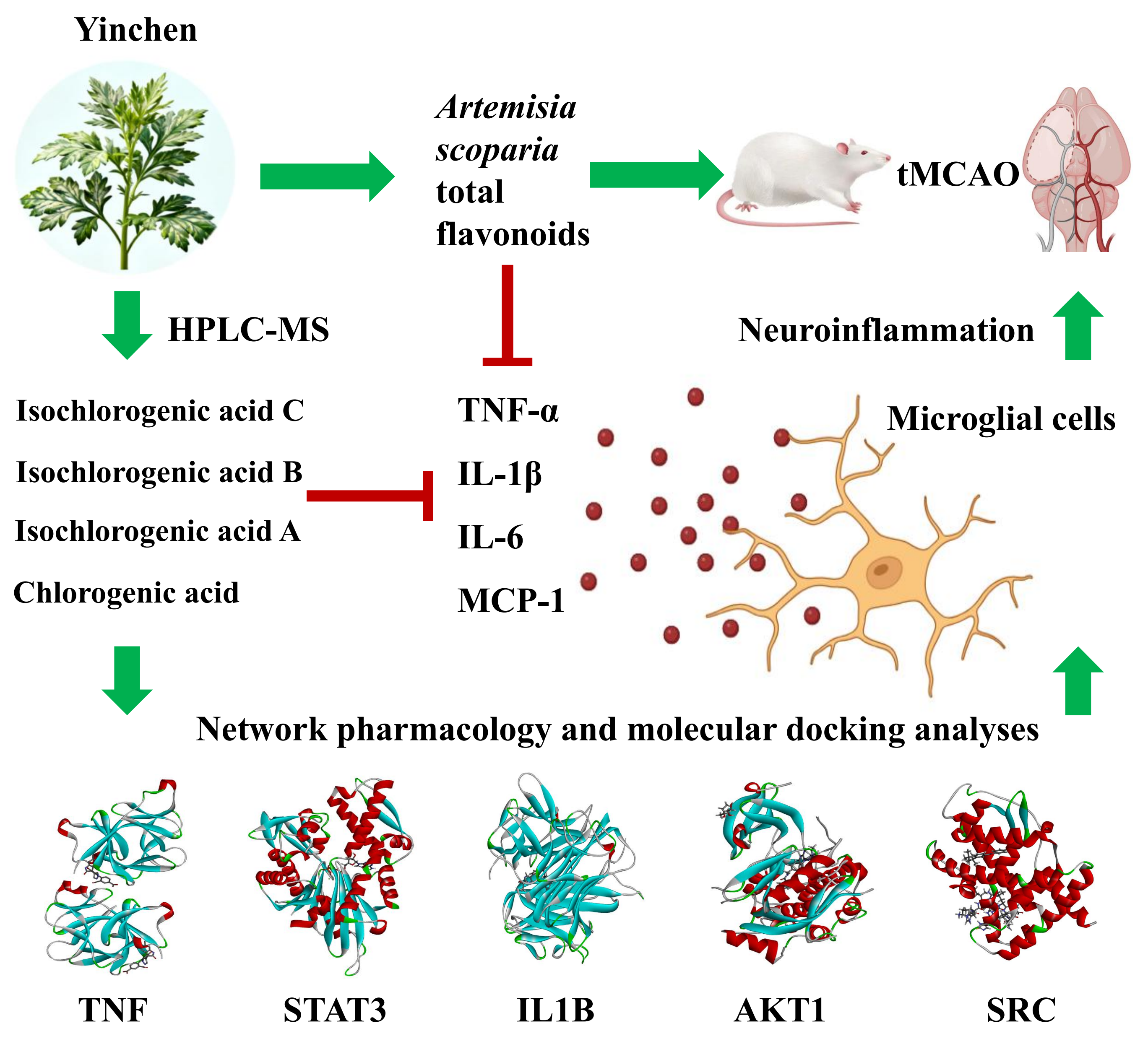 In the present study, we demonstrated that ASE, which is extracted from the TCM component Yinchen, improves neurological outcomes in tMCAO rats by mitigating neuroinflammation. Both ASE and its four characteristic constituents (isochlorogenic acid C, isochlorogenic acid B, isochlorogenic acid A, and chlorogenic acid) exhibited strong binding affinities for the five inflammatory and IS-associated targets (TNF, STAT3, IL1B, AKT1, and SRC) that we identified, and were further found to reduce the production of NO and the generation of pro-inflammatory factors (TNF-α, IL-1β, IL-6, and MCP-1) in LPS-induced BV2 microglial cells. While the traditional formula, Zhengan Xifeng Decoction, which contains Yinchen, has been used to treat IS [