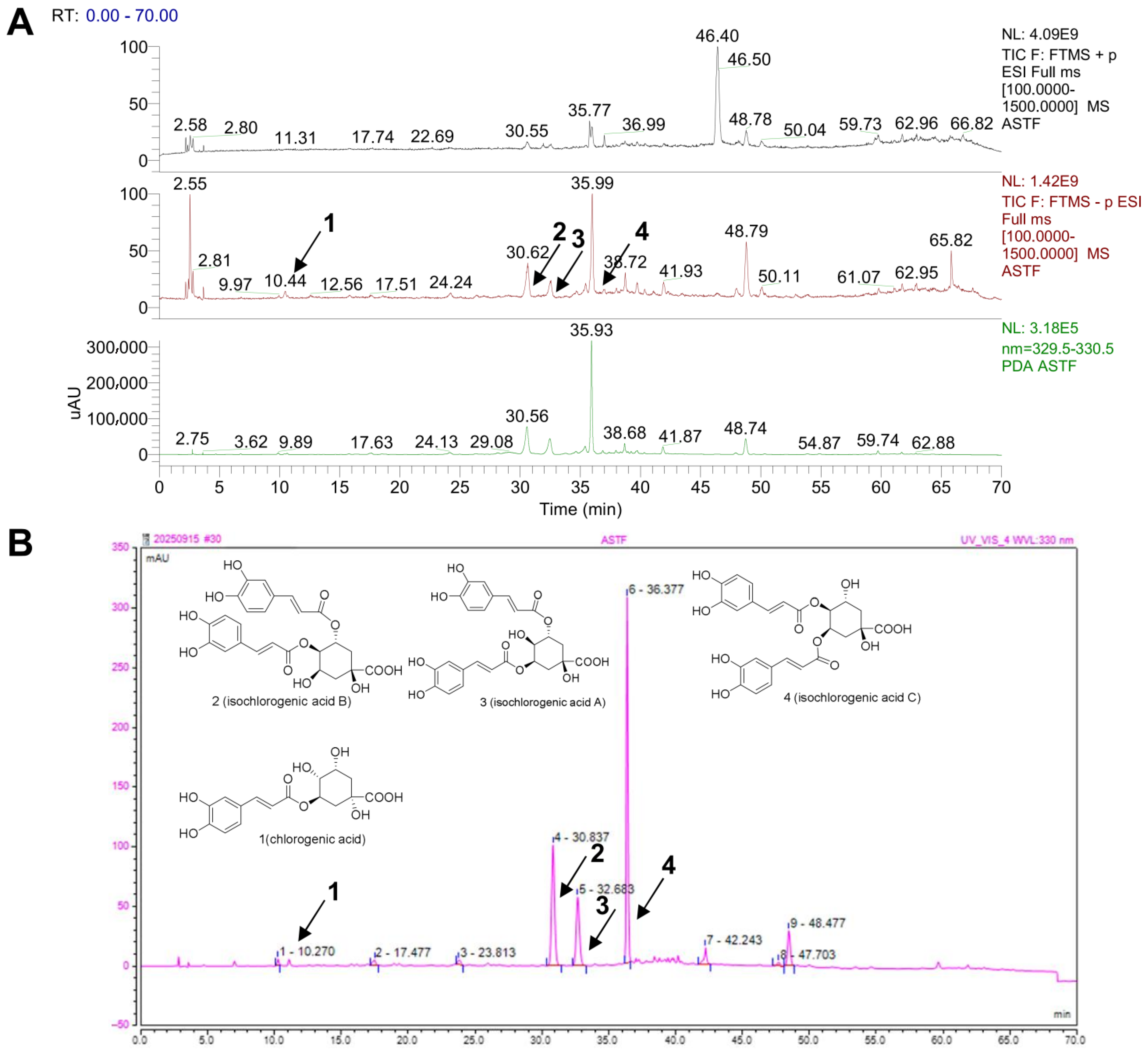 A quality control analysis of ASE, isochlorogenic acid C, isochlorogenic acid B, isochlorogenic acid A, and chlorogenic acid was performed using HPLC-DAD. Analytical HPLC was performed on a Thermo Ultimate 3000 instrument (Thermo, Waltham, MA, USA) using a Nano Chrom 120 C18 column (250 × 4.6 mm, 5 μm) with a flow rate of 1.0 mL/min, and the gradient program of MeCN/0.1% H3PO4 in H2O was 10:90 (t = 0 min), 15:85 (t = 10 min), 20:80 (t = 30 min), 30:70 (t = 35 min), 35:65 (t = 50 min), 40:60 (t = 55 min), 55:45 (t = 60 min), 65:35 (t = 65 min), and 90:10 (t = 70 min).