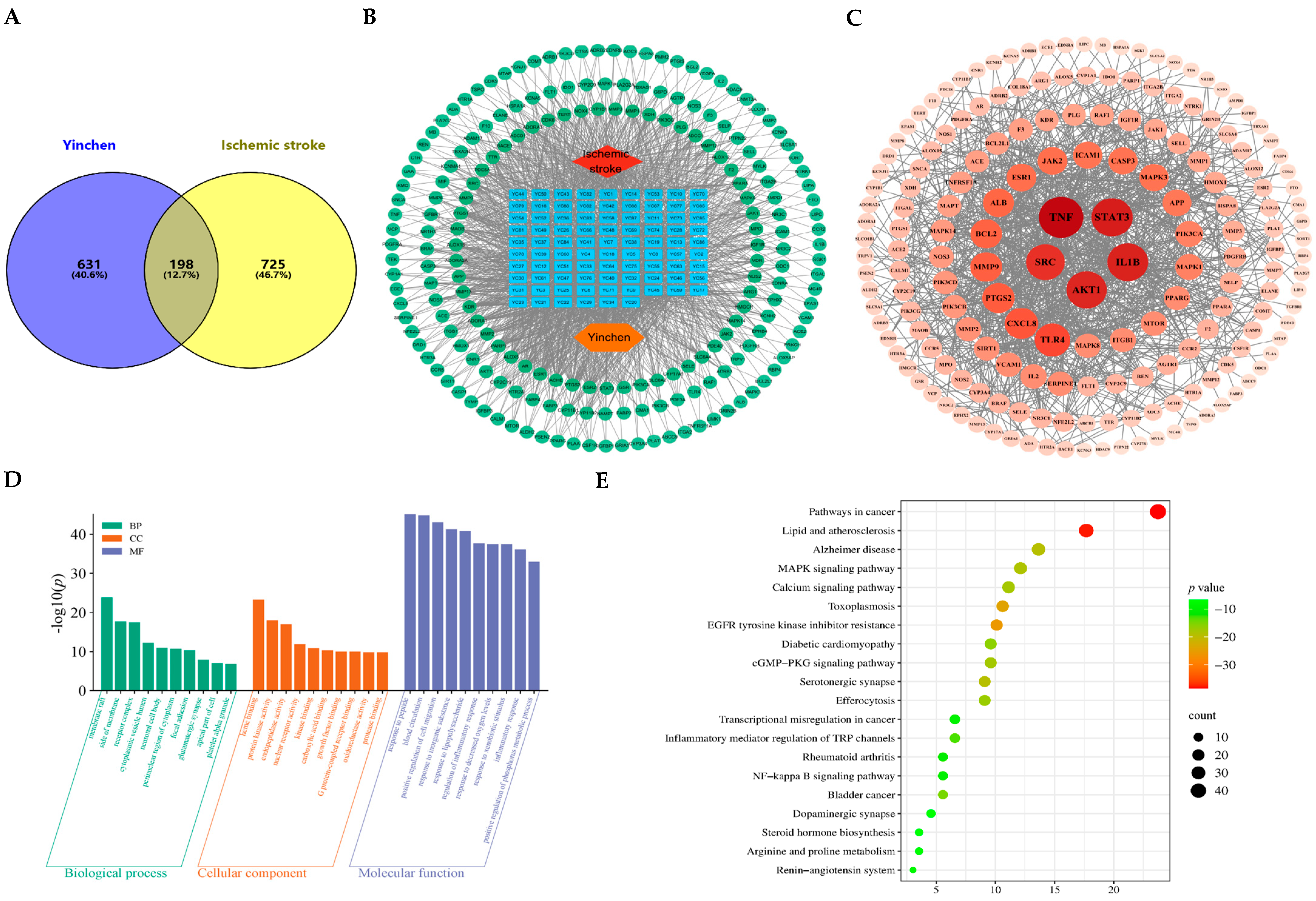 Though our study has verified the therapeutic potential of Yinchen against IS and elucidated its material basis through network pharmacology analysis and experimental study, it has certain limitations. Firstly, due to the inherent limitations of network pharmacology in comprehensively mapping bioactive entities, certain compounds and their corresponding target genes might be absent from public databases. Secondly, in this study, we established the classic tMCAO rat model of IS and preliminarily confirmed the neuroprotective effect of ASE and its inhibitory effects on pro-inflammatory cytokines in rat ischemic brain tissues. There is still a lack of evidence for its clinical application. Thirdly, though network pharmacology and our preliminary results have demonstrated the critical role of the identified inflammatory core targets and biological processes in enabling Yinchen’s effect against IS, the mechanisms for how Yinchen or its characteristic components specifically modulate these pathways were not investigated in this study. Our future research will still need to evaluate the potential therapeutic mechanisms of Yinchen against IS both in vivo and in vitro.