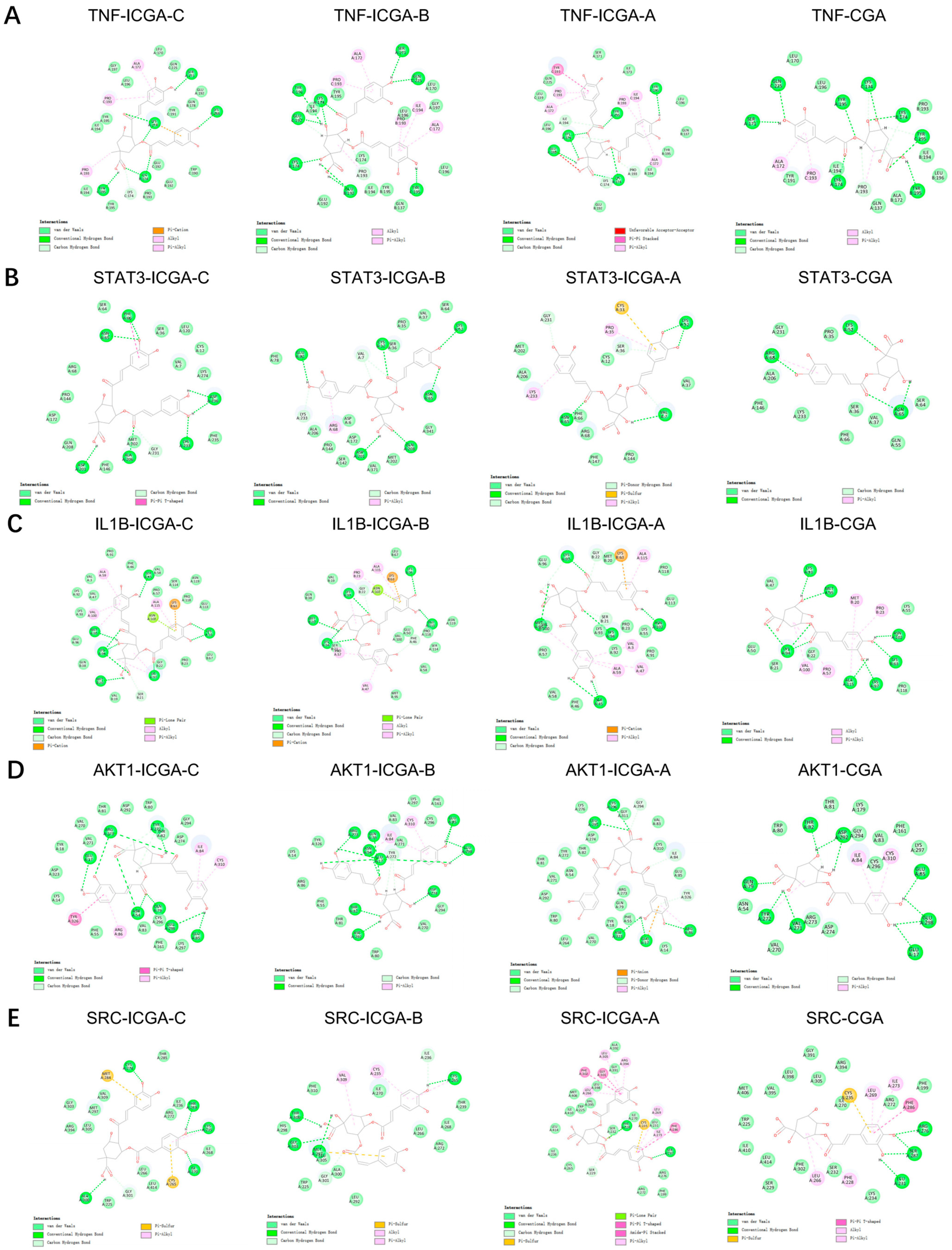 Molecular docking was performed on the first five core intersection targets and the effective components, which were identified by HPLC-MS of Yinchen. The 3D structure of the proteins corresponding to the top five core targets was downloaded from the protein database PDB (Protein Data Bank) (