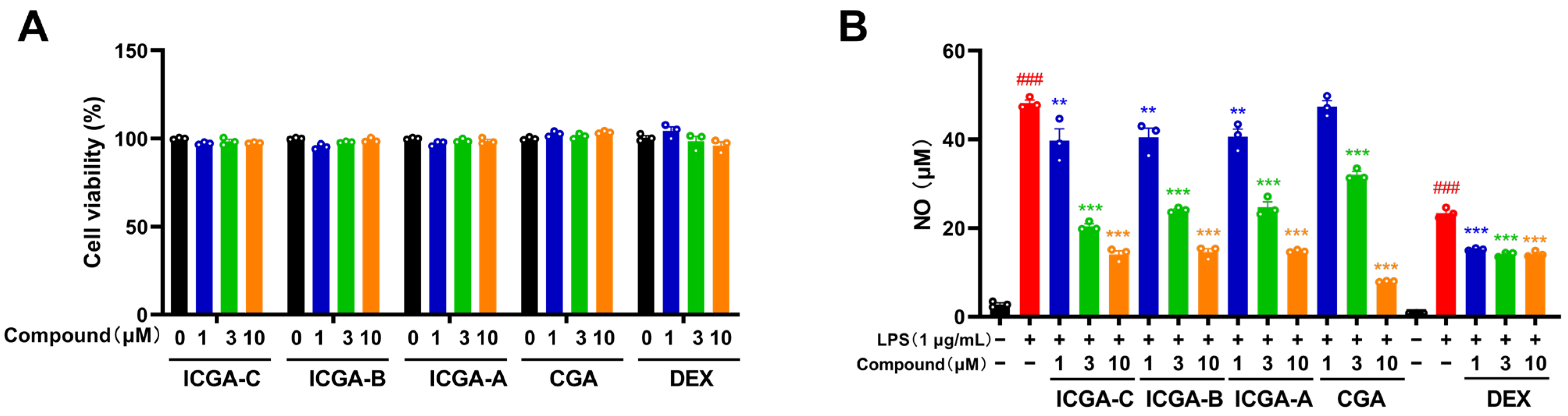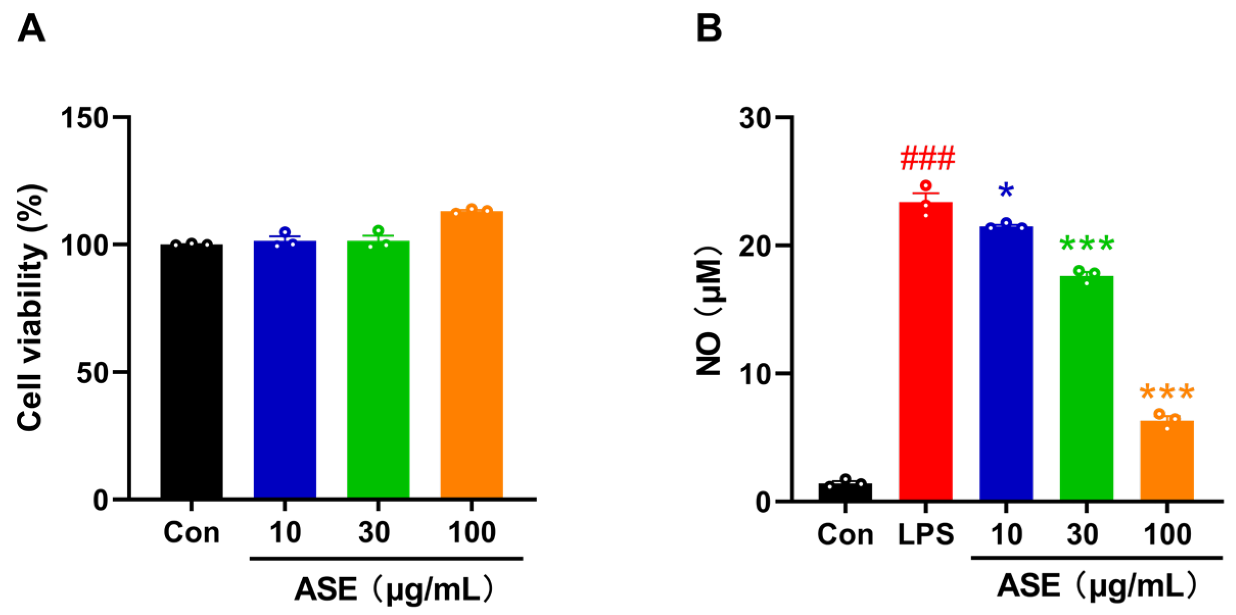 4 cells per well and incubated for 24 h. The cells were pretreated with compounds at the following stated concentrations (1, 3, and 10 μM) or ASE at the following specified concentrations (10, 30, and 100 μg/mL) for 2 h, followed by stimulation with LPS at 1 μg/mL for 24 h. After the incubation period, 50 μL of cell supernatant was collected, and NO levels were measured using a Griess reagent assay kit. The absorbance was then detected at 540 nm with a microplate reader. The nitrate concentration was calculated according to a standard curve generated from known concentrations of sodium nitrite [