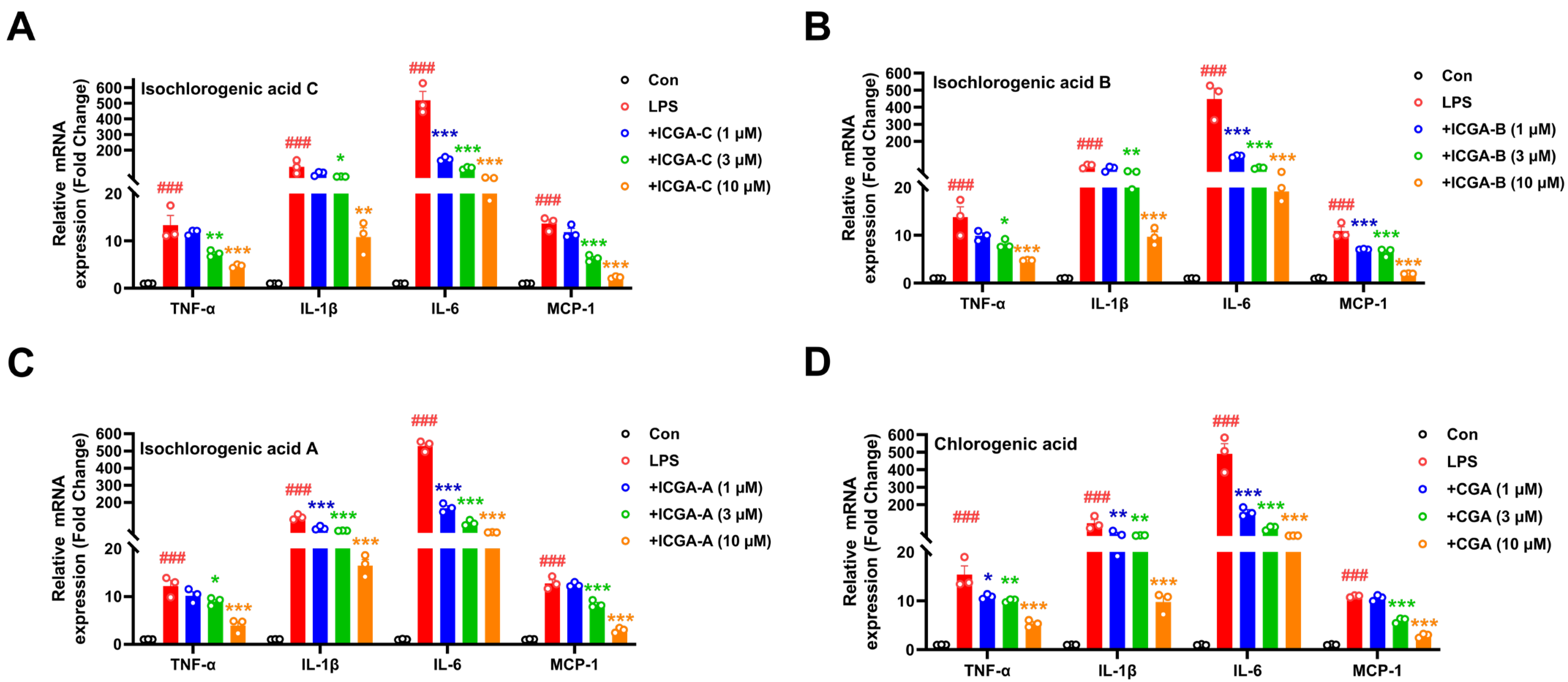 Isochlorogenic acid A, isochlorogenic acid B, isochlorogenic acid C, and dexamethasone were purchased from Shanghai Yuanye Bio-Technology Co., Ltd. (Shanghai, China); chlorogenic acid was purchased from Jiangsu Aikon Biopharmaceutical R&D Co., Ltd. (Heowns, Tianjin, China). The reagents were dissolved in DMSO (Aladdin, Beijing, China) and diluted in saline. Cell viability was evaluated using a CellTiter 96® AQueous One Solution Cell Proliferation Assay (MTS assay, Promega, Madison, WI, USA). The Griess reagent assay kit was purchased from Applygen Gene Technology Co., Ltd. (Beijing, China). RT-qPCR was performed with specific primers and SYBR® Premix Ex TaqTII (TakaRa Clontech, Dalian, China).
