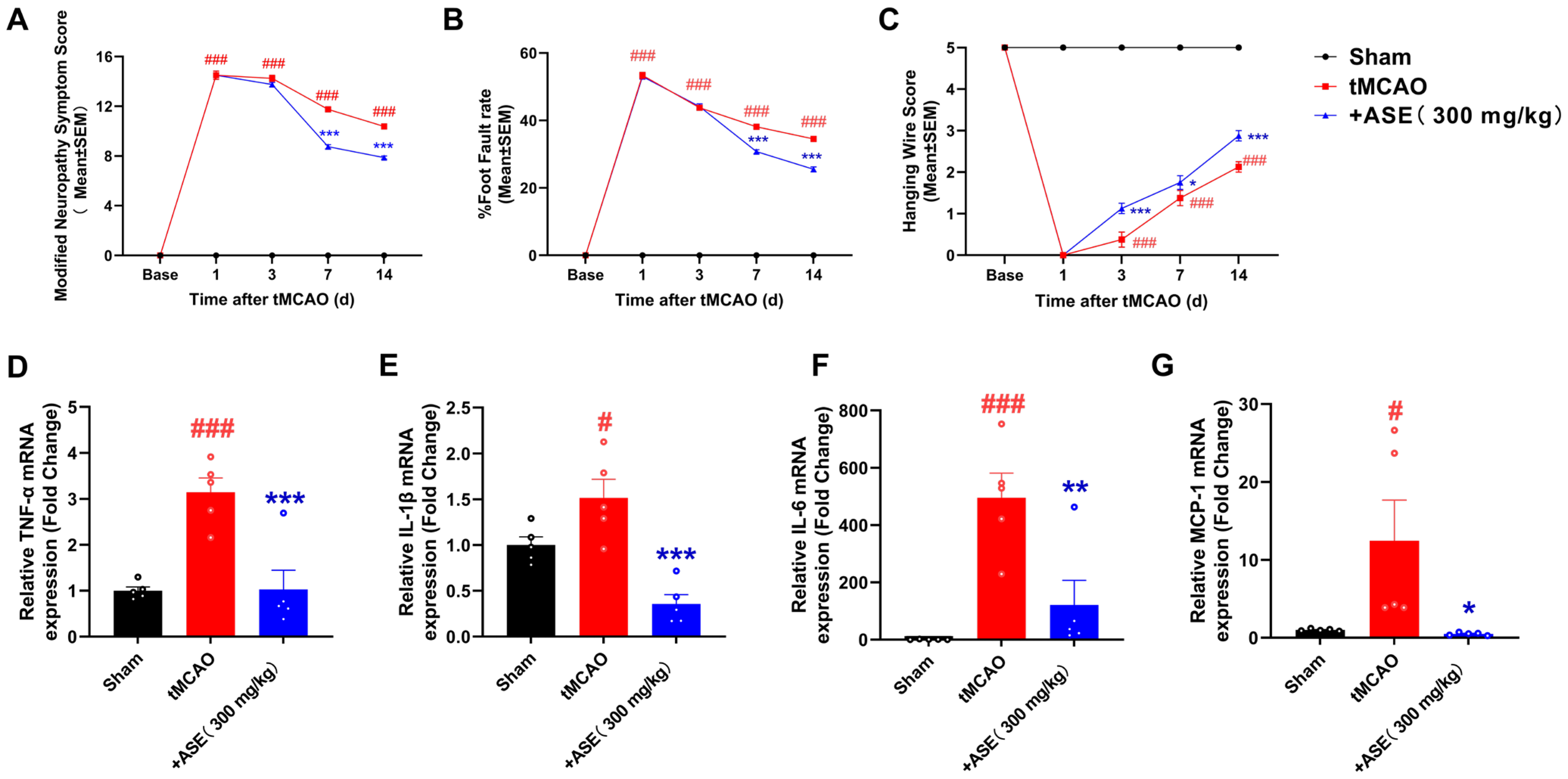 The rats were randomly assigned into 3 experimental groups of 8 rats each, as follows: sham group, tMCAO group, and ASE + tMCAO group (300 mg/kg) were given an intragastric administration (i.g.) of ASE as an aqueous suspension in 0.5% sodium carboxymethyl cellulose (CMC-Na) starting 24 h after tMCAO and repeated daily for a total of 14 days, and the sham and tMCAO groups were given an equivalent volume of 0.5% CMC-Na.