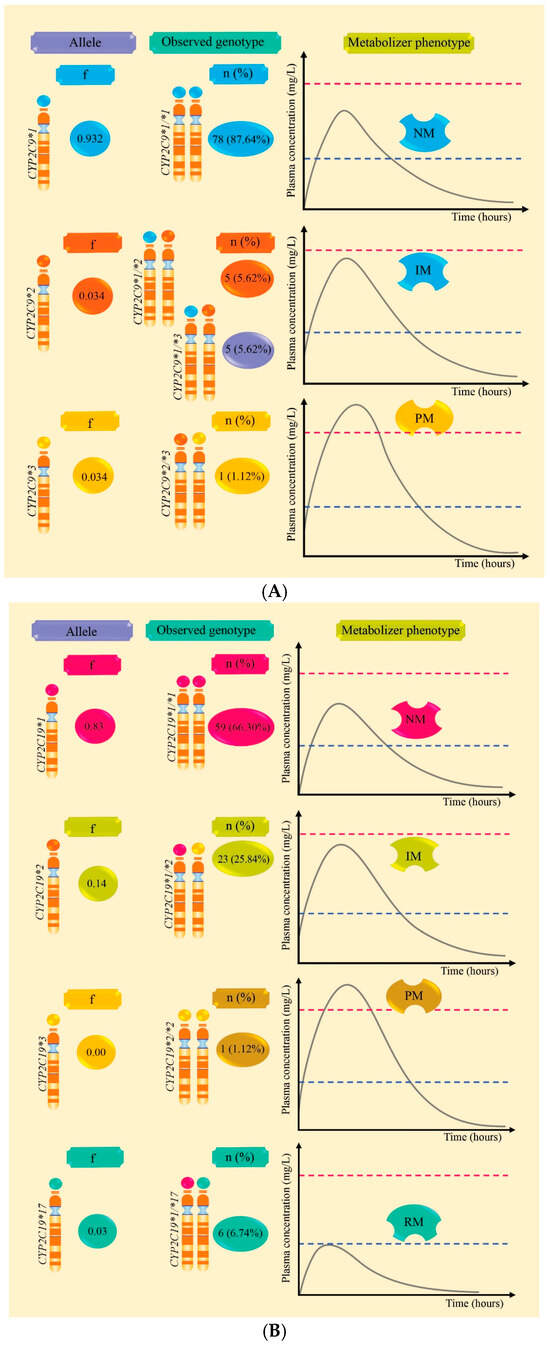 Allele frequencies, CYP2C9/CYP2C19 genotypes, and plasma level curves according to metabolic phenotype in Peruvian patients with epilepsy are outlined. Part (A) presents the frequency of CYP2C9 alleles and the percentages of genotypes that predict normal (NM), intermediate (IM), and poor (PM) metabolizers. Part (B) presents the frequency of CYP2C19 alleles and the percentages of genotypes that predict normal (NM), intermediate (IM), poor (PM), and rapid metabolizers (RM).