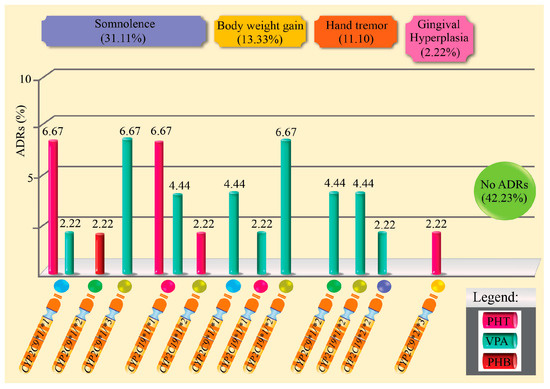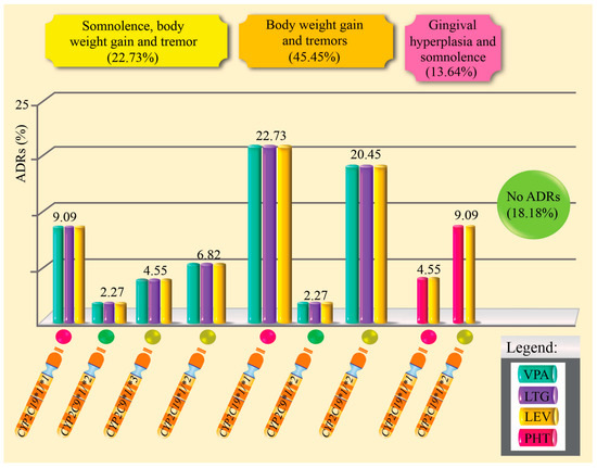 The ADRs observed in the intermediate and poor metabolizer patients in the present study were not severe, in contrast to those described in previous research. PHT is associated with gingival hyperplasia, epigastric pain, drowsiness, lethargy, headache, confusion [67], immune thrombocytopenia [68], and risk of liver injury [69]. Additionally, tremor, weight gain, hair loss [48], metabolic acidosis, hyperammonemia, hepatotoxicity, thrombocytopenia, and gastrointestinal disorders have been reported for VPA [70].