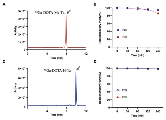Two DOTA-conjugated tetrazine derivatives, DOTA-Me-Tz and DOTA-H-Tz, were successfully radiolabeled with 68Ga at 95 °C for 15 min. The resulting radiotracers, 68Ga-DOTA-Me-Tz and 68Ga-DOTA-H-Tz, demonstrated high radiochemical purities, both exceeding 98% as determined by radio-HPLC (Figure 1A,C). The log p values were −2.87 ± 0.02 for 68Ga-DOTA-Me-Tz and −3.57 ± 0.21 for 68Ga-DOTA-H-Tz, indicating high hydrophilicity of both probes.