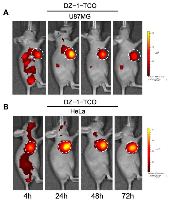 Fluorescence images of U87MG (A) and HeLa (B) tumor models after intravenous injection of DZ-1-TCO. White dashed circles indicate the tumor regions.