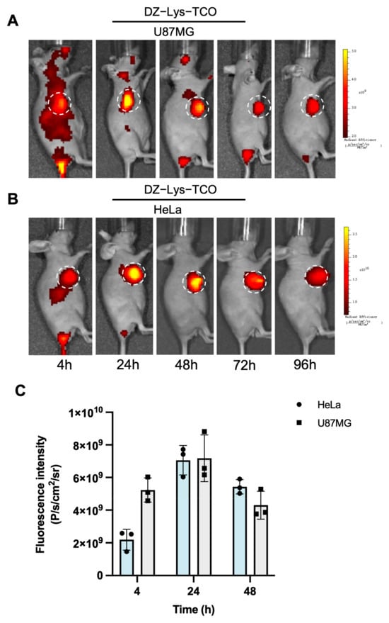 (A) In vivo fluorescence imaging of DZ-Lys-TCO in U87MG tumor-bearing mice. (B) In vivo fluorescence imaging of DZ-Lys-TCO in HeLa tumor-bearing mice. (C) Semi-quantitative analysis of fluorescence intensity in tumor regions. White dashed circles indicate tumor locations.