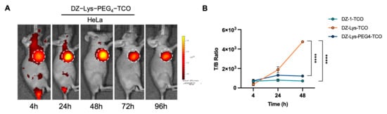 (A) In vivo fluorescence imaging of DZ-Lys-PEG4-TCO in HeLa tumor-bearing mice. (B) Tumor-to-background fluorescence intensity ratios of DZ-1-TCO, DZ-Lys-TCO, and DZ-Lys-PEG4-TCO (**** p < 0.0001). White dashed circles indicate tumor locations.