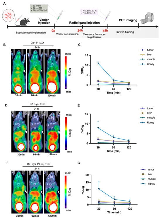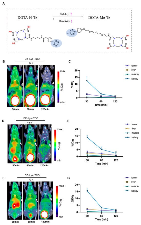 (A) Chemical structures of DOTA-Me-Tz and DOTA-H-Tz. The pink arrows indicate the relative increase in stability (↑) and reactivity (↑) between the two tetrazines. (B,D,F) Representative micro-PET/CT images at various time points after injection of 68Ga-DOTA-H-Tz following pre-administration of DZ-Lys-TCO at 24 h (B), 48 h (D), and 72 h (F); White arrows highlight tumor sites. (C,E,G) Quantitative biodistribution analysis (%ID/g) in tumor, liver, kidney, and muscle corresponding to the 24 h (C), 48 h (E), and 72 h (G) imaging time points.