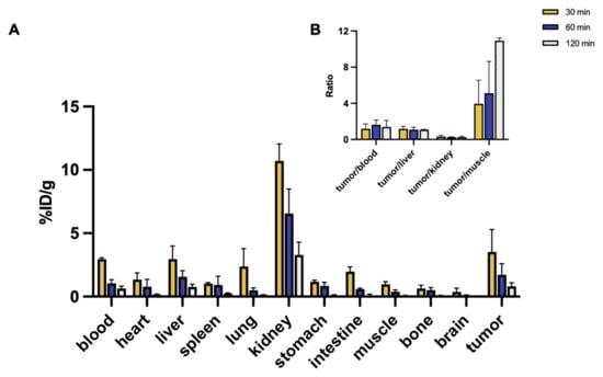 Tumor uptake was 3.53 ± 1.76 %ID/g at 30 min, 1.72 ± 0.87 %ID/g at 60 min, and 0.82 ± 0.28 %ID/g at 120 min. Tumor-to-background ratios improved over time, with tumor-to-blood ratios of 1.18 ± 0.55, 1.63 ± 0.53, and 1.39 ± 0.74; tumor-to-liver ratios of 1.18 ± 0.28 (30 min) and 1.07 ± 0.05 (120 min); and tumor-to-muscle ratios rising from 3.95 ± 2.59 to 10.92 ± 0.31. Bone uptake remained consistently low (<0.70 %ID/g) (Figure 7 and Table S2).