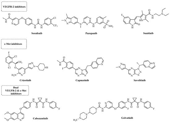 Hepatocyte growth factor (HGF) receptor tyrosine kinase c-Met is another important modulator of tumor angiogenesis, invasion, and metastasis. Phosphorylation events triggered by c-Met activation initiate downstream signaling pathways associated with tumor growth and metastasis [7]. Since resistance to VEGFR-targeted treatments has been associated with overexpression of c-Met, it is an essential supplementary target [8]. Numerous selective c-Met inhibitors have been developed (Figure 1), such as savolitinib (in clinical trials for renal cell carcinoma), capmatinib and tepotinib (authorized for MET exon 14-altered NSCLC), and crizotinib (initially an ALK/c-Met inhibitor, FDA-approved for NSCLC) [9].