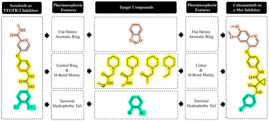 All things considered, this logical design approach guarantees that the novel derivatives satisfy the pharmacophoric requirements of both c-Met inhibition and VEGFR-2 inhibition. In comparison to current single-target inhibitors, the newly created compounds are anticipated to exhibit strong dual-target activity by fusing the structural characteristics of sorafenib and cabozantinib within a single molecular framework. This could lead to improved pharmacokinetic characteristics and increased therapeutic efficacy.
