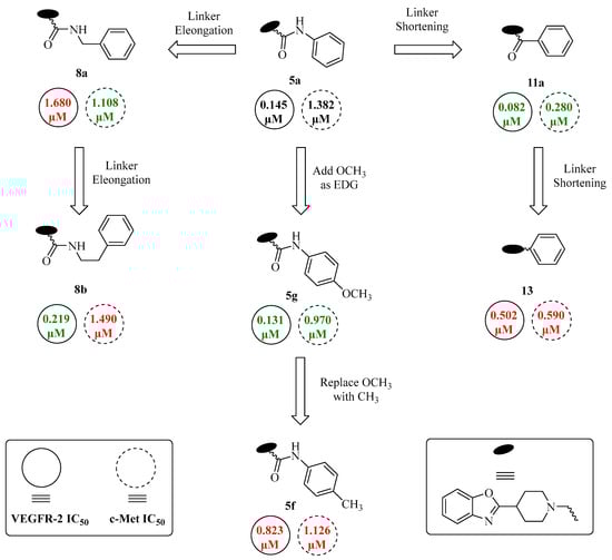With IC50 values of 0.145 µM (VEGFR-2) and 1.382 µM (c-Met), the unsubstituted phenyl derivative 5a (acetamide series) demonstrated modest dual inhibitory activity. The inhibitory action against c-Met was somewhat enhanced (1.108 µM) but significantly decreased against VEGFR-2 (1.680 µM) with linker elongation by substituting a benzyl moiety (8a) for the phenyl ring. In comparison to 8a, further elongation by adding an ethylphenyl linker (8b) resulted in a considerable increase in activity against VEGFR-2 (0.219 µM) but a decrease in potency against c-Met (1.490 µM). The inhibitory action against both targets was significantly increased by linker shortening by changing the acetamide linker into an ethanone linker (11a), which produced IC50 values of 0.082 µM (VEGFR-2) and 0.280 µM (c-Met) in comparison to 5a. However, compound 13, which further shortens the linker by eliminating the carbonyl group, lost its activity against both kinases (0.502 µM, VEGFR-2; 0.590 µM, c-Met). These results suggest that excessive shortening reduces activity; however, the ethanone linker is ideal for achieving dual inhibitory efficacy (Figure 3).