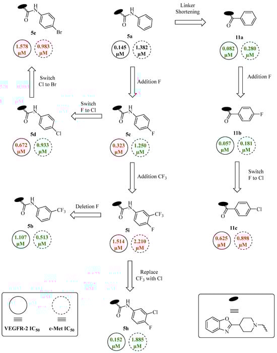 The addition of a fluorine atom at the para position (11b) considerably increased the inhibitory activity against both kinases in halogenated compounds, beginning with the unsubstituted analogue 11a (plain phenyl moiety), yielding IC50 values of 0.057 µM (VEGFR-2) and 0.181 µM (c-Met) in comparison to 11a (0.280 and 0.082 µM, respectively). However, a significant decrease in activity against both targets (0.898 µM, c-Met; 0.625 µM, VEGFR-2) was observed when a bulkier chlorine atom was substituted for fluorine (11c), indicating that steric hindrance at the para position had a detrimental effect on binding affinity (Figure 4).