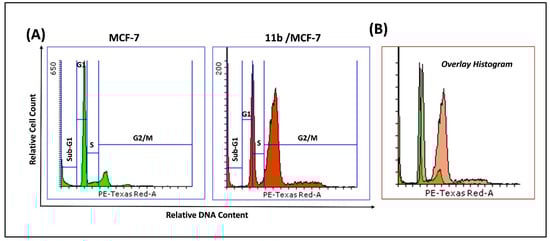 Flow cytometric analysis of cell cycle phases post-treatment of the cells with the tested compound 11b for 72 h. (A) Cell cycle analysis was performed by flow cytometry. (B) Overlay histogram of the representative histograms compound compared to the control after 72 h treatment.