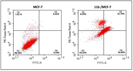 Flow cytometric analysis of apoptosis in the tested compound 11b on MCF-7 cells treated for 72 h. Representative scatter plots of PI vs. annexin V showing the images and percentages of cell apoptosis in MCF-7 (left) and compound 11b-treated cells (right).