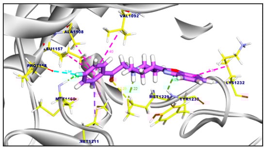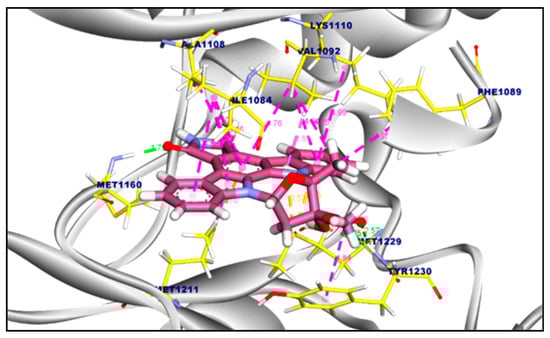Meanwhile, the co-crystallized ligand staurosporine, complexed with c-Met kinase, demonstrated an affinity score of −9.27 kcal/mol with an RMSD value of 0.18 Å, confirming the reliability of the docking protocol (Figure 14 and Table 5). Staurosporine was stabilized by fifteen hydrophobic interactions, including π–alkyl, π–sulfur, and π–sigma contacts with Ile1084, Met1211, Tyr1230, Phe1089, Met1229, Lys1110, Val1092, and Ala1108. In addition, three hydrogen bonds were observed with Met1160, Tyr1230, and Met1229, at distances of 1.79 Å, 2.57 Å, and 2.23 Å, respectively (Figure 15 and Table 5).