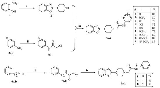 The synthetic pathway for novel piperidinyl-based benzoxazole derivatives 5a–i, 8a,b, 11a–c, and 13 was accomplished, as depicted in Scheme 1 and Scheme 2. 2-Aminophenol 1 was refluxed with piperidine-4-carboxylic acid in the presence of polyphosphoric acid (PPA), undergoing cyclization to yield the desired intermediate, 2-(piperidin-4-yl)benzo[d]oxazole 2 [14]. Different aromatic amines 3a–i and aliphatic amines 6a,b were treated with chloroacetyl chloride to prepare the corresponding intermediates 4a–i and 7a,b in the presence of TEA [15,16]. The final target acetamides 5a–i (75–89% yield) and 8a,b (89–91% yield) were prepared in acetone via nucleophilic substitution through the reaction of 4a–i and 7a,b with 2-(piperidin-4-yl)benzo[d]oxazole 2, utilizing K2CO3 and KI as a base catalyst, Scheme 1.