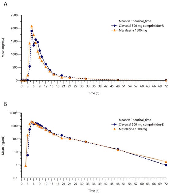 Plot of mean concentration of mesalazine versus time in linear (A) and semilogarithmic (B) scales.