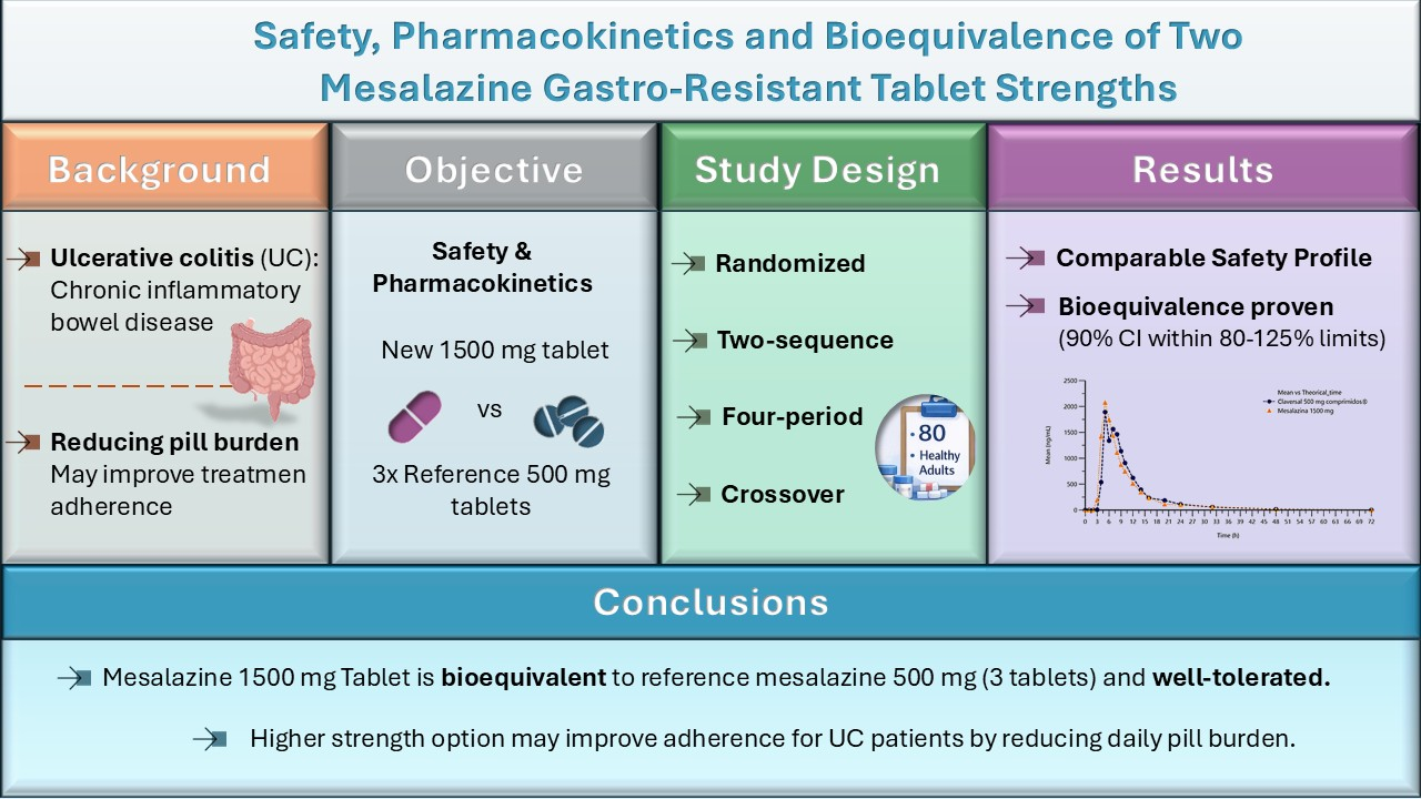 The strength of this study lies in its large sample size, which provides robust evidence that the higher-strength formulation of 1500 mg mesalazine gastro-resistant tablets is bioequivalent to the original formulation, with comparable pharmacokinetic and safety profiles. Additionally, the new formulation offers a clinical relevance strategy to reduce pill burden, potentially improving patient compliance and treatment efficacy. However, a notable limitation is that the 1500 mg tablet may not be suitable for individuals who have difficulty swallowing larger pills. Furthermore, as the study was specifically designed to evaluate bioequivalence, it included only healthy individuals without comorbidities or concomitant medications, in alignment with EMA guidelines. As a result, diversity among participants was not prioritized, and the study was conducted at a single site.