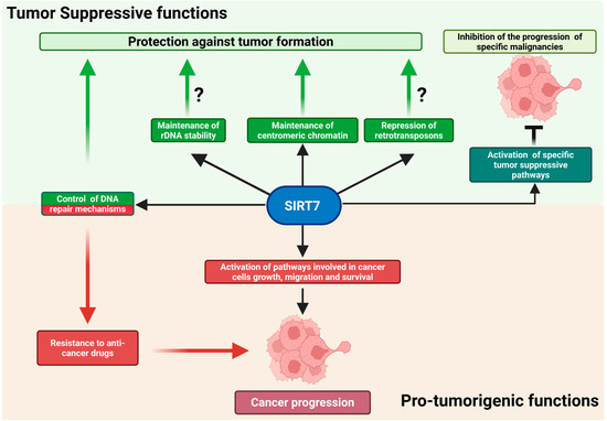 Paradoxically, as discussed below, SIRT7 functions as a potent pro-tumorigenic factor in most cancers—even in those where it initially counteracts tumor development. This apparent contradiction reveals a striking duality: while SIRT7 protects against tumor initiation, it can also promote tumor growth and progression once malignancy is established [1].