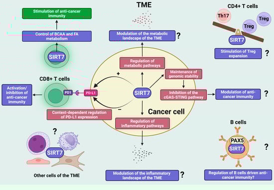 SIRT7 is an emerging regulator of anti-cancer immunity through tumor-intrinsic and -extrinsic mechanisms. SIRT7 is an emerging key regulator of anti-cancer immunity, coordinating both tumor-intrinsic programs and microenvironmental interactions. It modulates immune checkpoint signaling through context-dependent regulation of PD-L1 expression, thereby positively or negatively influencing cytotoxic-T-cell-driven anti-cancer immunity. Beyond this mechanism, SIRT7 shapes immune responses by controlling metabolic pathways within immune and potentially cancer cells. In CD8+ T cells, SIRT7 governs branched-chain amino acid (BCAA) and fatty acid (FA) metabolism, supporting metabolic fitness and effector function against tumors. In cancer cells, SIRT7’s central role in the regulation of additional metabolic pathways may collectively remodel the metabolic landscape of the TME and ultimately influence anti-cancer immune responses, though this requires further experimental confirmation. In addition to metabolic control, SIRT7 regulates immune cell function through non-metabolic mechanisms, including modulation of the Th17/Treg balance and regulation of B cell-driven immunity through interaction with lineage-regulating factors such as PAX5—processes that are likely to influence anti-cancer immune responses. Finally, by maintaining genomic stability and restraining activation of the cGAS–STING pathway, SIRT7 links genome protection and inflammatory signaling, thereby potentially influencing anti-cancer immunity. Question marks in the figure indicate mechanisms that are regulated by SIRT7 and are known to influence anti-cancer immunity, although it remains to be determined whether SIRT7 modulates immune responses through these pathways. Created in BioRender. Vazquez Prat, B. (2025) https://BioRender.com/h64j5za (accessed on 4 December 2025).