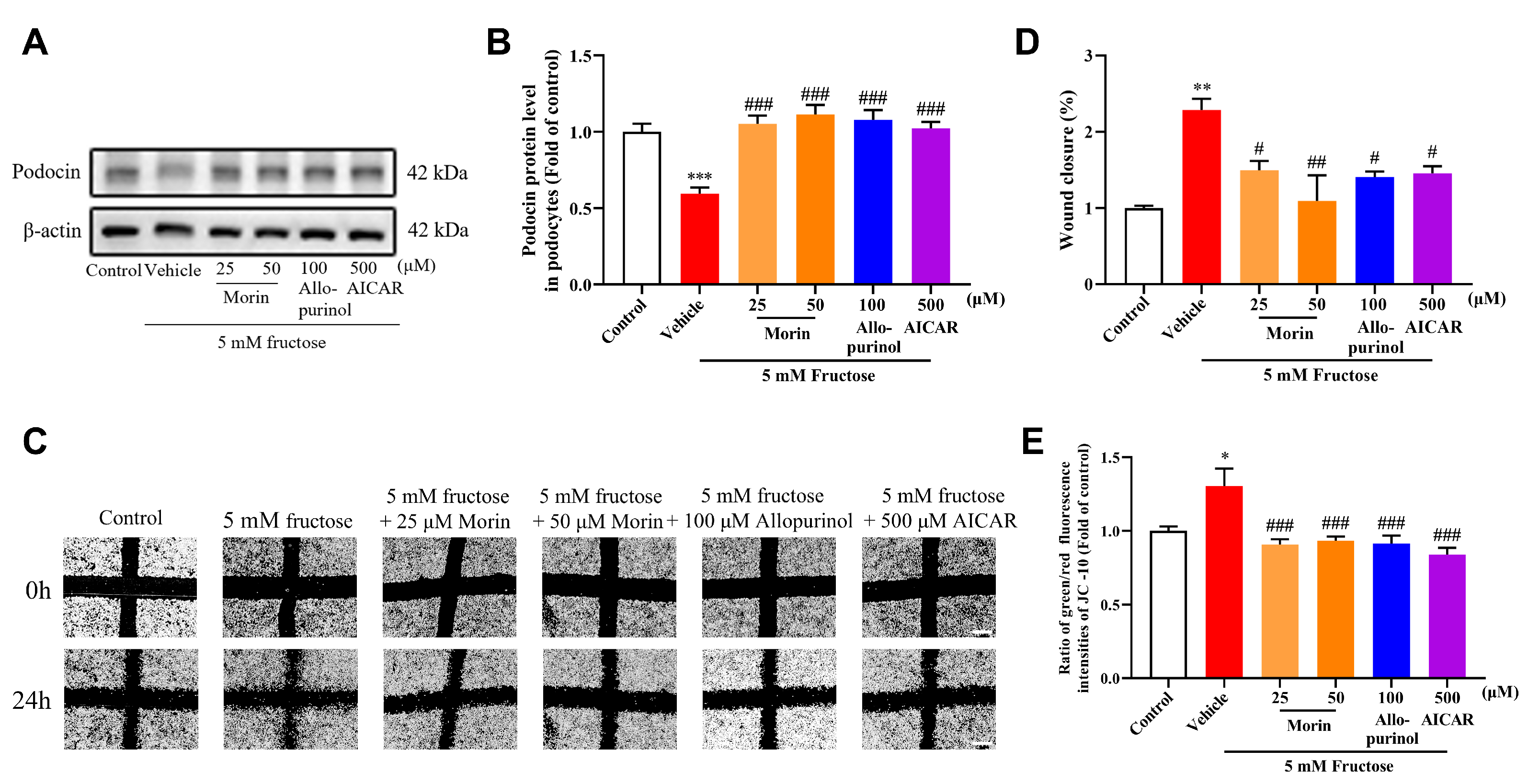 2.1. Morin Ameliorates High-Fructose-Induced Podocyte Injury and Mitochondrial Dysfunction in Mouse Podocyte Clone-5 (MPC5)