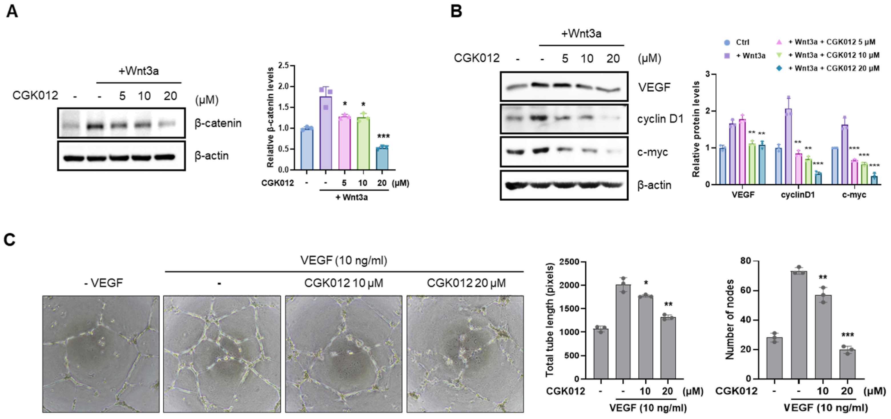 2.3. CGK012 Inhibits the Wnt/β-Catenin Pathway and Capillary Tube Formation in HUVECs