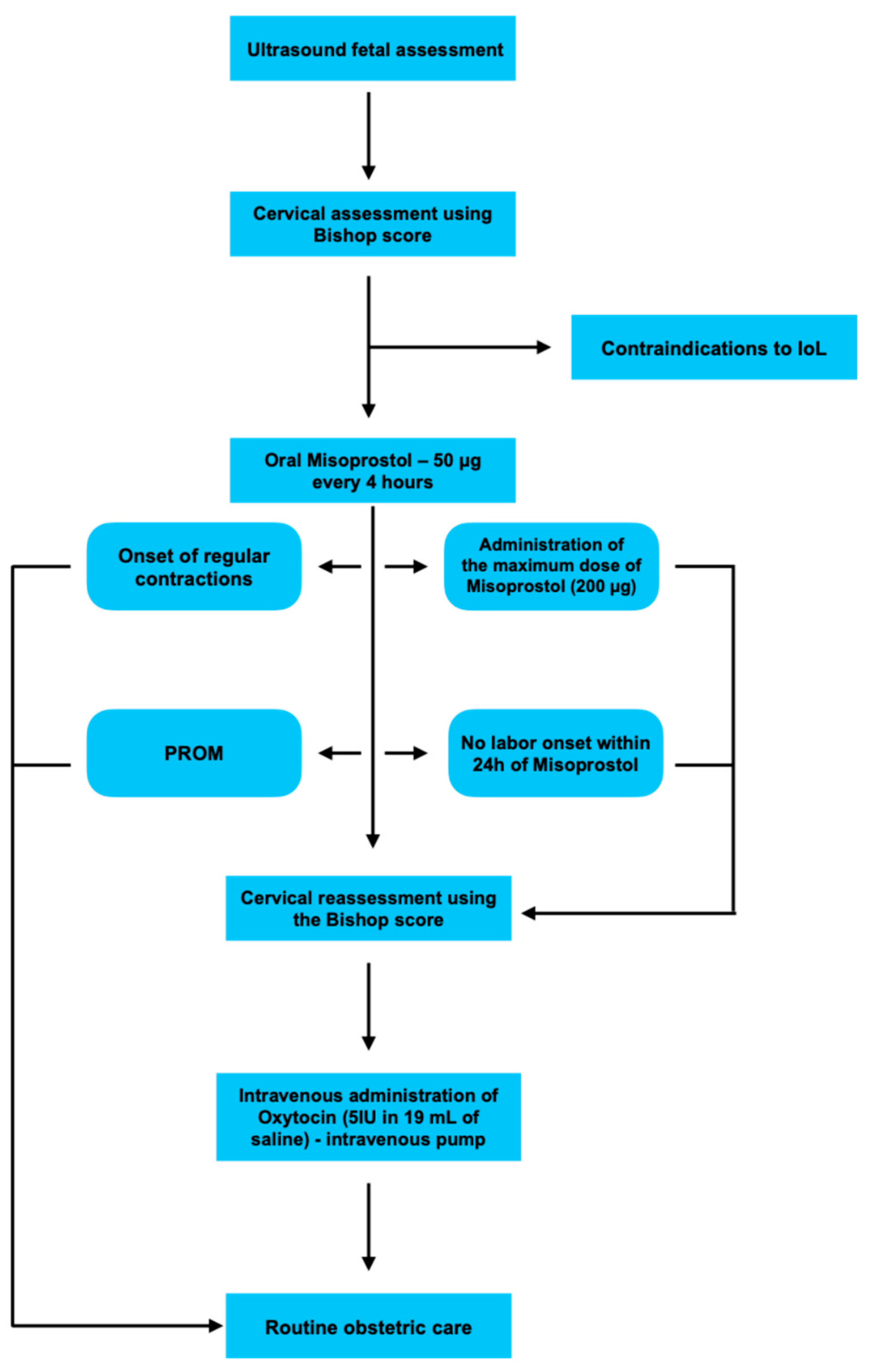 - Ameri, A.; Jafari-Azar, Z.; Anabi, M.; Davari Dolatabadi, M. Effect of Misoprostol versus Oxytocin on Delivery Outcomes after Labour Induction in Pregnant Women: A Systematic Review and Meta-Analysis of Randomized Controlled Trials. Eur. J. Obstet. Gynecol. Reprod. Biol. 2024, 292, 75–88. [Google Scholar] [CrossRef] [PubMed]