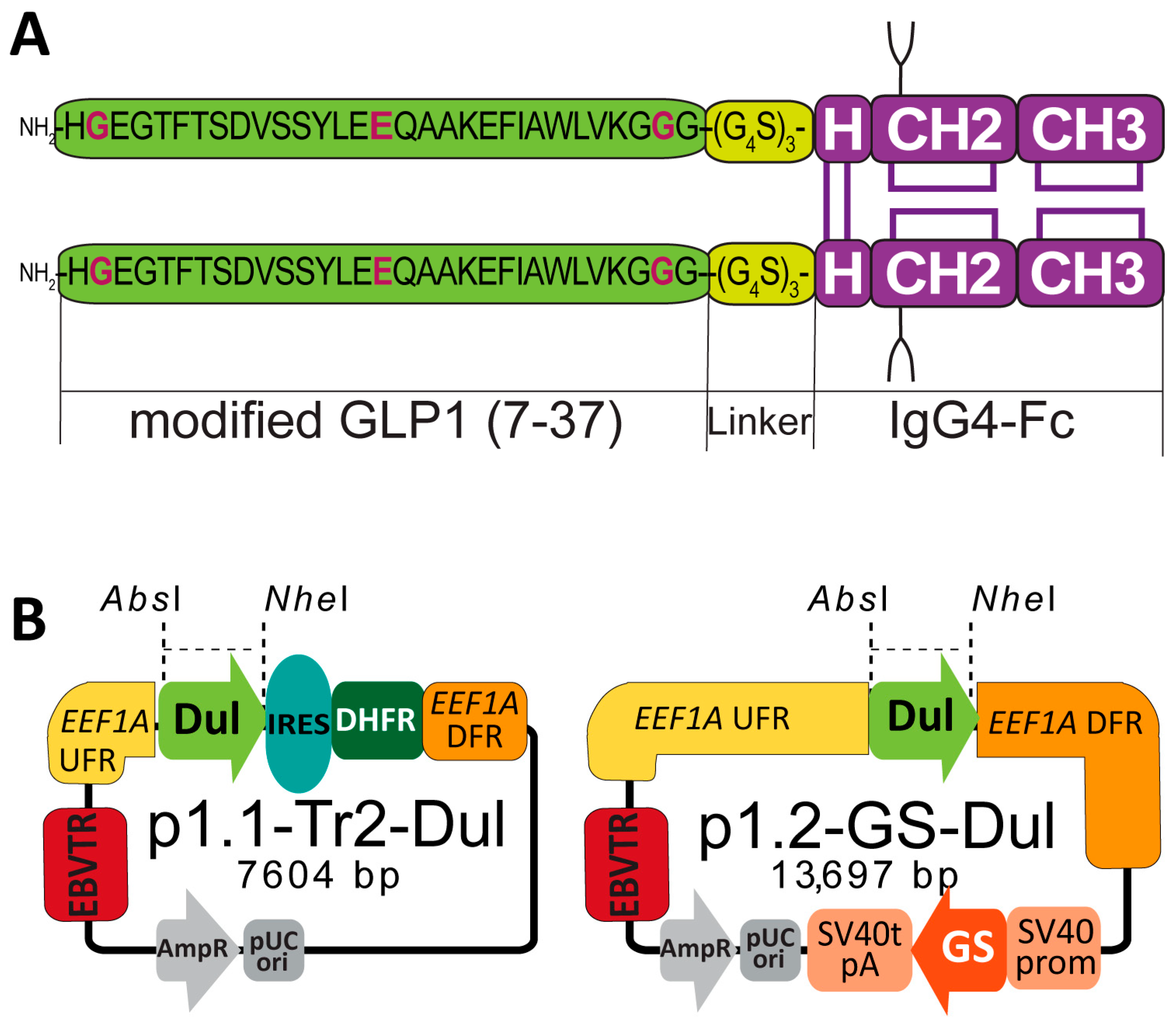 - Chen, Y.; Xiao, H.-P.; Zhang, X.-Y. Expression and Characterization of Recombinant GLP-1-IgG4-Fc Fusion Protein. China Biotechnol. 2018, 38, 58–66. [Google Scholar] [CrossRef]