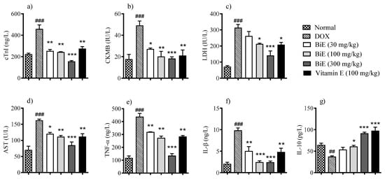 Pro-inflammatory markers TNF-α and IL-1β were elevated (p < 0.001) in the DOX group, at 435 ± 28 ng/L and 9.8 ± 0.63 ng/L, respectively, compared with the normal control group, at 115 ± 18 ng/L and 2.0 ± 0.45 ng/L, respectively. BiE treatment prevented the increase in TNF-α and IL-1β levels in a dose-dependent manner, with the maximum reductions observed with BiE 300 mg/kg: 133 ± 18 ng/L and 2.4 ± 0.37 ng/L, respectively. Similarly, vitamin E treatment also significantly reduced these pro-inflammatory markers (p < 0.01), as shown in Figure 1e,f. Anti-inflammatory marker IL-10 was decreased to 37 ± 2.4 pg/L in the DOX group. At the same time, BiE treatment increased serum IL-10, with a maximum increase of 91 ± 3.3 pg/L observed in the 300 mg/kg-treated group, which was significant (p < 0.001) compared to the DOX group. Vitamin E treatment also increased (p < 0.001) the IL-10 as compared to the diseased group (Figure 1g).