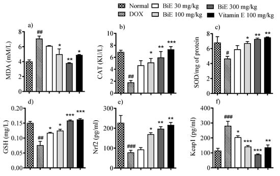 BiE and vitamin E treatment effects on tissue concentrations of (a) MDA, (b) CAT, (c) SOD, (d) GSH, (e) Nrf2, and (f) Keap1 in doxorubicin-induced cardiotoxicity. Data (mean ± SEM, n = 5) were analyzed using one-way ANOVA with Tukey’s post hoc test. Comparisons between the DOX and Normal groups are indicated by hash symbols, with significance levels shown as # = p < 0.01, ## = p < 0.01, and ### = p < 0.001. In contrast, differences between the BiE or vitamin E groups and the DOX group are indicated by asterisks, with significance levels denoted as * = p < 0.05, ** = p < 0.01, and *** = p < 0.001.