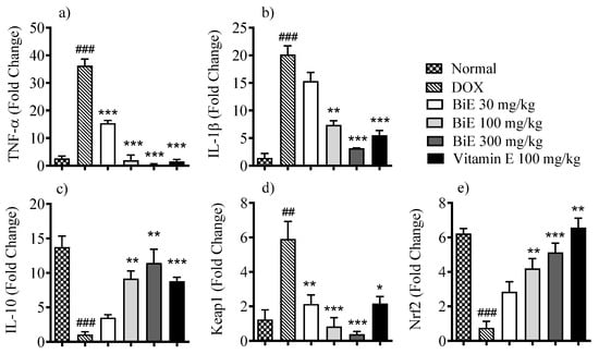The effects of BiE treatment on mRNA expression levels of various inflammatory and oxidative stress markers were assessed to determine the roles of inflammation and oxidative stress regulation. Melt-curve analyses confirmed single-peak amplification for each target. Amplification efficiencies ranged between 93 and 105%, within acceptable limits for comparative Ct analysis. The mRNA levels of pro-inflammatory markers, i.e., TNF-α and IL-1β, were increased in the DOX group, with 36 ± 2.4- and 20 ± 1.6-fold increases, respectively. In contrast, anti-inflammatory interleukin IL-10 levels decreased by 1.1 ± 0.40-fold compared with the normal group (Figure 3). BiE treatment prevented the inflammation caused by DOX in a dose-dependent manner, with the highest effects seen at 300 mg/kg, as mRNA expression of TNF-α (0.38 ± 0.32-fold change; p < 0.001), IL-1β (3.2 ± 0.07-fold change; p < 0.001), and IL-10 (11 ± 2.0-fold change; p < 0.001) was observed. Vitamin E also decreased TNF-α (p < 0.001), IL-1β (p < 0.01), and increased IL-10 (p < 0.01) significantly (Figure 3a–c). BiE treatments also modulated the Keap1/Nrf2 signaling pathway. It decreased the mRNA expression of Keap1 at a 300 mg/kg dose (0.38 ± 0.16-fold change; p < 0.001) compared to the DOX group (5.9 ± 1.0-fold change, p < 0.001) and increased Nrf2 mRNA expression (5.1 ± 0.54-fold change; p < 0.01), compared to the DOX group (0.76 ± 0.38-fold change). The BiE 300 mg/kg group effect was comparable to the vitamin E treatment group (Figure 3d,e).
