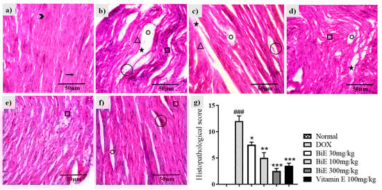 Histological changes in cardiac tissue following BiE and vitamin E treatment in DOX-induced cardiotoxicity (40×, scale bar = 50 µm). Representative H&E-stained sections from: (a) Normal, (b) DOX, (c) BiE 30 mg/kg, (d) BiE 100 mg/kg, (e) BiE 300 mg/kg, (f) vitamin E 100 mg/kg groups, and (g) histopathological scoring, where data (mean ± SEM) was analyzed using one-way ANOVA with Tukey’s post hoc test. Significance between the DOX and Normal groups is indicated as ### = p < 0.001. In contrast, significance between the BiE or vitamin E groups and the DOX group is indicated by asterisks, denoted as * = p < 0.05, ** = p < 0.01, and *** = p < 0.001. Annotations: arrow = normal cardiac fibers; arrowhead = myocardial nuclei; square = wavy or fragmented fibers; star = tissue edema; triangle = inflamed myocytes; circle = vascular congestion; seven-point star = intracellular vacuolation.