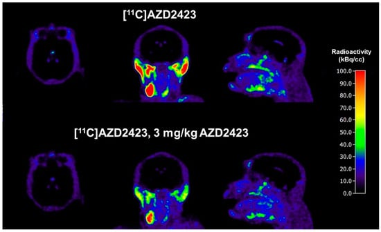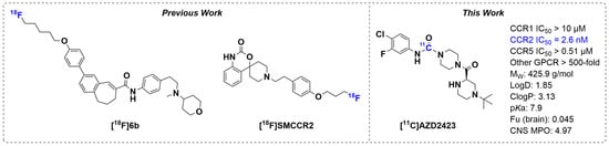 AZD2423 is a negative allosteric modulator of the CCR2 receptor, originally developed for the treatment of neuropathic pain [17,18,19]. AZD2423 has many of the desired properties for a successful PET ligand intended for neuroimaging (Figure 1), which include, high affinity (2.6 nM) and good selectivity for CCR2, a molecular weight < 500 g/mol, moderate Log D (1.85), as well as favorable CNS multiparameter optimization (MPO, 4.97) [20] and brain slice distribution (0.045) values.
