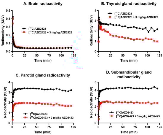 Figure 4. Average time-activity curves (n = 2) for the brain (A), thyroid gland (B), parotid gland (C), and submandibular gland (D) at baseline (filled circles) and pretreatment conditions (filled boxes) following intravenous administration of [11C]AZD2423.