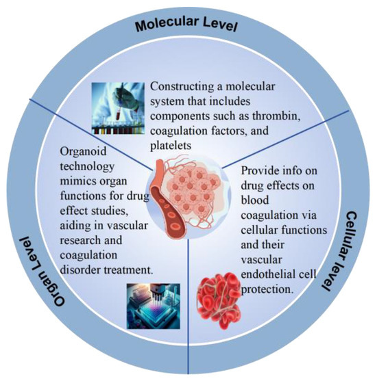 The cellular level plays a significant role in the screening of anticoagulant medicines, providing direct information on how medicines affect cellular functions during the blood coagulation process. For example, the effects of medicines on platelet function can be observed through platelet aggregation experiments [20], platelet release reaction tests, etc. Fang [21] and their team confirmed through platelet aggregation experiments and platelet release reaction tests that curcumin plays an important role in regulating the AMPK-V/T-αIIbβ3 signaling pathway to inhibit thrombin-induced platelet aggregation. In addition, experiments at the cellular level can directly assess the protective effects of medicines on vascular endothelial cells. Zhang [22] and their team found that baicalin protects vascular endothelial cells from thrombin-induced cell damage by inhibiting the expression of PAR-1 and its downstream NF-KB activation. Screening at the cellular level can more intuitively demonstrate the relationship between the effects of medicines on the corresponding signaling pathways and their anticoagulant effects.