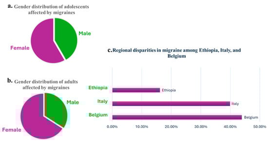 Overview of migraine prevalence and distribution: (a) gender distribution of adolescents affected by migraines, showing a higher prevalence among girls compared to boys; (b) gender distribution of adults affected by migraines, emphasizing a greater proportion of women compared to men; (c) comparison of migraine prevalence in selected high-income (Belgium and Italy) and low-income (Ethiopia) countries, used as examples to highlight disparities in healthcare access and diagnostic capabilities.