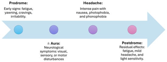 A comprehensive understanding of this progression, which unfolds in four phases: prodromal, aura, headache, and postdromal (Figure 2), is crucial for elucidating both the variability of the migraine experience and the underlying pathophysiological mechanisms.