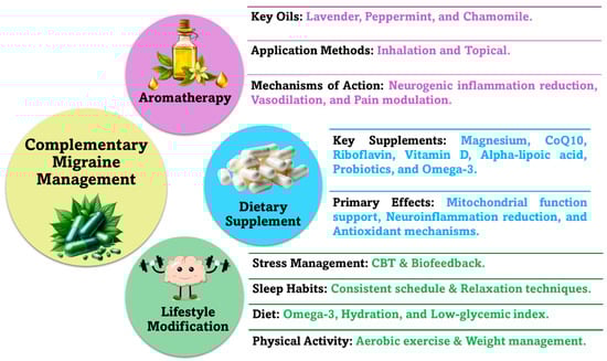 - Hajhashemy, Z.; Golpour-Hamedani, S.; Eshaghian, N.; Sadeghi, O.; Khorvash, F.; Askari, G. Practical supplements for prevention and management of migraine attacks: A narrative review. Front. Nutr. 2024, 11, 1433390. [Google Scholar] [CrossRef] [PubMed]