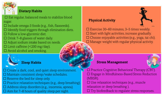 Similarly, elevated cortisol levels during stress disrupt circadian rhythms, which regulate essential functions like sleep–wake cycles. Chronic cortisol elevation increases brain excitability, heightening sensitivity to pain and triggering migraine attacks []. Additionally, circadian disruptions lead to poor sleep, a well-known migraine trigger. Together, these factors amplify the frequency and severity of migraines, highlighting the importance of stress management in prevention [,].