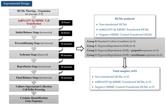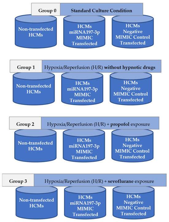 The H/R induction procedure was performed in non-transfected HCMs, miRNA-197-3p MIMIC-transfected HCMs, and negative control MIMIC-transfected HCMs. All these cell types were included in four study groups subjected to different culture conditions: Group 0, HCMs cultured under standard conditions (n = 2); Group 1, HCMs subjected to the H/R procedure and not exposed to hypnotic drugs (n = 3); Group 2, HCMs subjected to the H/R procedure and exposed to sevoflurane as a halogenated hypnotic drug (n = 3); and Group 3, HCMs subjected to the H/R procedure and exposed to propofol as a non-halogenated hypnotic drug (n = 3) (Figure 5).