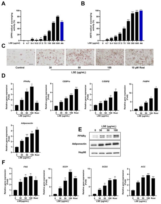 Antioxidant activities of Lagopsis supina extract (LSE): The radical scavenging activity of DPPH (A) and ABTS (B) was assessed at varying concentrations of LSE. Results are presented as mean ± SEM (n = 3). Ascorbic acid (AA, 150 µg/mL) served as positive control. Adipogenesis and lipogenic gene expression induced by LSE: Effects of LSE on adipogenesis were studied in 3T3-L1 cells differentiated using induction medium containing 0.17 × IBMX, dexamethasone, and insulin (DMI). Cells were treated with LSE (30, 50, 100 µg/mL), a control treatment, or rosiglitazone (10 µM) as a positive control. (C) Oil red O staining visualized intracellular lipid accumulation; the scale bar represents 100 µm at 200× magnification. (D) Quantitative real-time PCR (qRT-PCR) analyzed adipogenesis-related gene expression, including PPARγ, C/EBPα, C/EBPβ, FABP4, and adiponectin. (E) Western blot analysis evaluated protein levels of PPARγ and adiponectin, with HSP90 used as a loading control. (F) qRT-PCR quantified mRNA levels of lipogenesis-associated genes such as SCD1, SCD2, FAS, and ACC. Data are shown as mean ± SEM from two independent experiments (n = 4). Statistical significance relative to the control group is denoted as * p < 0.05, ** p < 0.01, and *** p < 0.001.