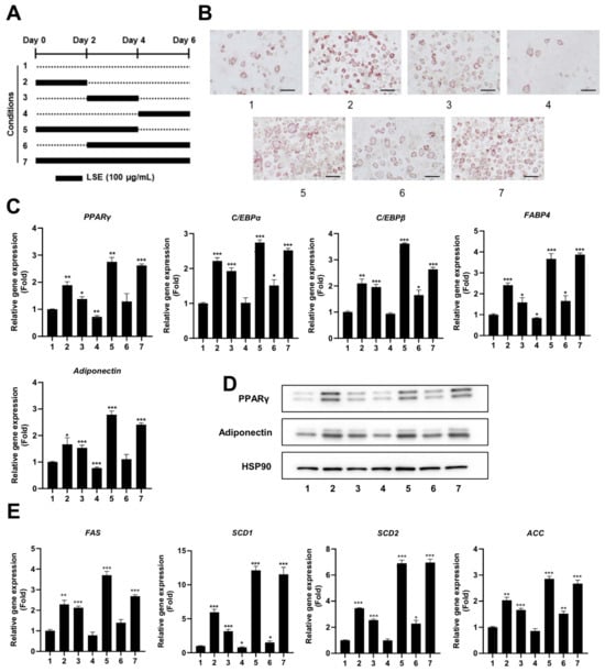 Time-dependent effects of LSE on adipocyte differentiation: (A) A schematic diagram illustrates the experimental design, where 3T3-L1 cells were treated with 100 µg/mL LSE for different durations (Groups 1–7), starting 2 days after reaching confluence. (B) Oil red O staining visualized intracellular lipid accumulation after 6 days of treatment. The scale bar represents 100 µm at 200× magnification. (C) On Day 6, total RNA was extracted, and qRT-PCR analyzed mRNA levels of adipogenesis-related genes, including PPARγ, C/EBPα, C/EBPβ, FABP4, and Adiponectin. (D) Western blotting evaluated protein levels of PPARγ and Adiponectin, using HSP90 as a loading control. (E) qRT-PCR quantified mRNA expression of lipogenesis-related genes, including SCD1, SCD2, FAS, and ACC. Data are presented as mean ± SEM from two independent experiments. Statistical significance relative to the control group is denoted as * p < 0.05, ** p < 0.01, and *** p < 0.001.