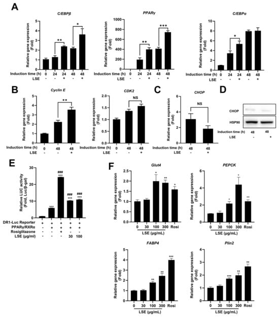 Effects of LSE on early adipogenesis and cell cycle regulation: 3T3-L1 cells were cultured to confluence over 48 h, followed by treatment with 100 μg/mL LSE. (A) qRT-PCR analyzed mRNA levels of adipogenesis-related genes, including PPARγ, C/EBPα, and C/EBPβ. (B) mRNA levels of cell cycle-related genes Cyclin E and CDK2 were quantified using qRT-PCR. (C) CHOP mRNA levels were assessed via qRT-PCR, and (D) protein expression of CHOP, a cellular stress response marker, was analyzed by Western blotting. (E) LSE’s effect on PPARγ activity was determined by transfecting h293a cells with DR-1-Luc containing PPRE sequences upstream of a luciferase gene; cells were treated with LSE (30 and 100 μg/mL) or rosiglitazone (10 μM) for 24 h, and luminescence levels were normalized to β-gal assay O.D. values. (F) The effect of LSE on PPARγ target gene expression was examined by treating differentiated adipocytes with 100 μg/mL LSE, 10 μM rosiglitazone (positive control), or DMSO (negative control) for 2 days, followed by qRT-PCR analysis. Data represent mean ± SEM from two independent experiments. Statistical significance is denoted as * p < 0.05, ** p < 0.01, and *** p < 0.001; ### p < 0.001 compared to DR-Luc Reporter/PPARγ/RXRα -transfected cells; NS = not significant.